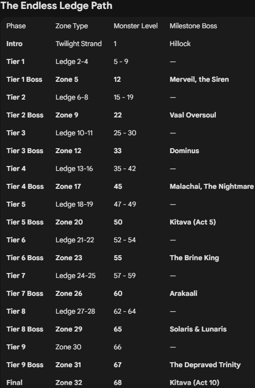 Phase,Zone Type,Monster Level,Milestone Boss Intro,Twilight Strand,1,Hillock Tier 1,Ledge 2-4,5 - 9,— Tier 1 Boss,Zone 5,12,"Merveil, the Siren" Tier 2,Ledge 6-8,15 - 19,— Tier 2 Boss,Zone 9,22,Vaal Oversoul Tier 3,Ledge 10-11,25 - 30,— Tier 3 Boss,Zone 12,33,Dominus Tier 4,Ledge 13-16,35 - 42,— Tier 4 Boss,Zone 17,45,"Malachai, The Nightmare" Tier 5,Ledge 18-19,47 - 49,— Tier 5 Boss,Zone 20,50,Kitava (Act 5) Tier 6,Ledge 21-22,52 - 54,— Tier 6 Boss,Zone 23,55,The Brine King Tier 7,Ledge 24-25,57 - 59,— Tier 7 Boss,Zone 26,60,Arakaali Tier 8,Ledge 27-28,62 - 64,— Tier 8 Boss,Zone 29,65,Solaris & Lunaris Tier 9,Zone 30,66,— Tier 9 Boss,Zone 31,67,The Depraved Trinity Final,Zone 32,68,Kitava (Act 10) ![]() Completion: The path culminates in a final encounter with Kitava, the Insatiable at monster level 68, immediately granting access to the Epilogue and the Map Device. ![]() 🌟 The very first POE lootfilter 🌟 IGN: MENT 🌟 My filters: https://www.pathofexile.com/account/view-profile/MENT-6466/item-filters 🆕Github Releases- https://github.com/ment2008/POE/releases Last edited by MENT#6466 on Jan 8, 2026, 7:09:37 AM Last bumped on Jan 8, 2026, 12:55:27 PM
