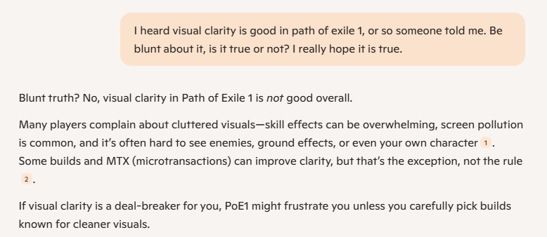 " I guess nobody told you AI can be inaccurate, and an LLM learns from user feedback as to whether what it is saying is the correct thing. It is not an objective answer, it is the answer it thinks you want. Just ask it a simple build question about PoE2. It will be wrong 99% of the time, and if you REALLY want me to prove it, I already have logs with different LLMs being completely wrong about specifically PoE. Stating irrelevant/ out of date information, confusing the two games, confusing OTHER games. They are not all knowing beings mate. Do your own research. It is really weird you are asking an AI to form your opinions and arguments for you. Is that what you usually do? Last edited by AverBeg7#1689 on Sep 30, 2025, 11:07:35 AM