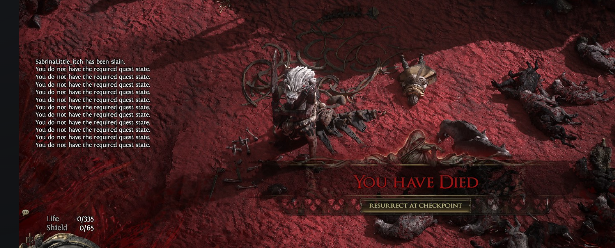 Не могу заспавнится после смерти. Приходится выходить на экран выбора персонажа и оттуда загружаться в игру. Вылезает ошибка "you don't have the required quest state"