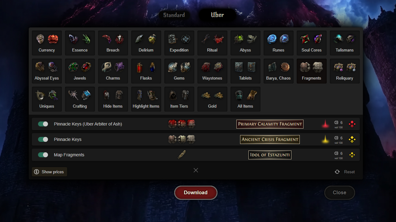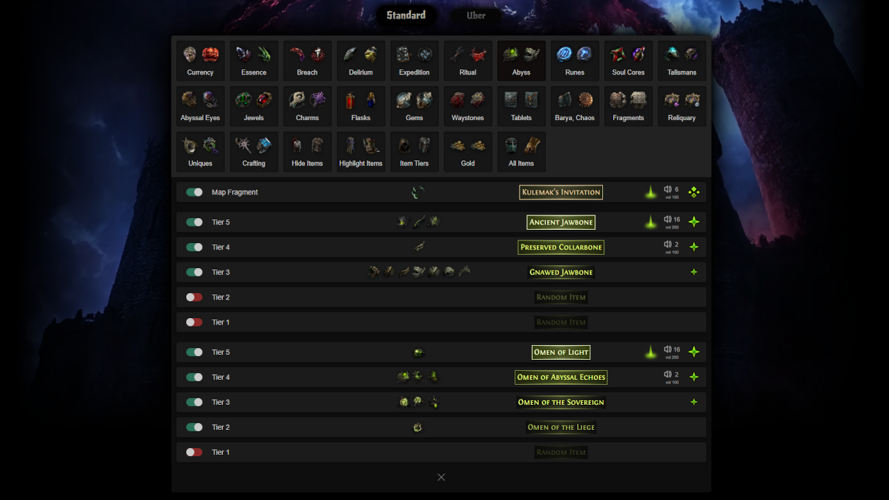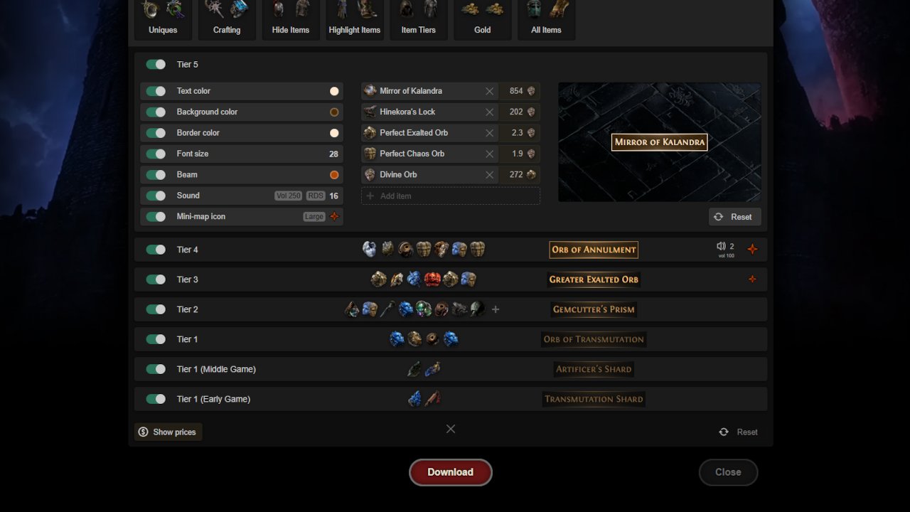 - Added a "Show prices" button to display the prices of all items in tiers. - Prices are now updated automatically every day. - Items are automatically distributed into tiers based on their prices daily. - Added a "Reset" button for categories. - Removed beam effects for Expedition Logbook, Kulemak's Invitation, Deadly Fate, Cowardly Fate, and Victorious Fate, since they only drop in specific locations and are easy to notice. ![]() Author of DemonFilter.com - Path of Exile 2 Loot Filter Generator