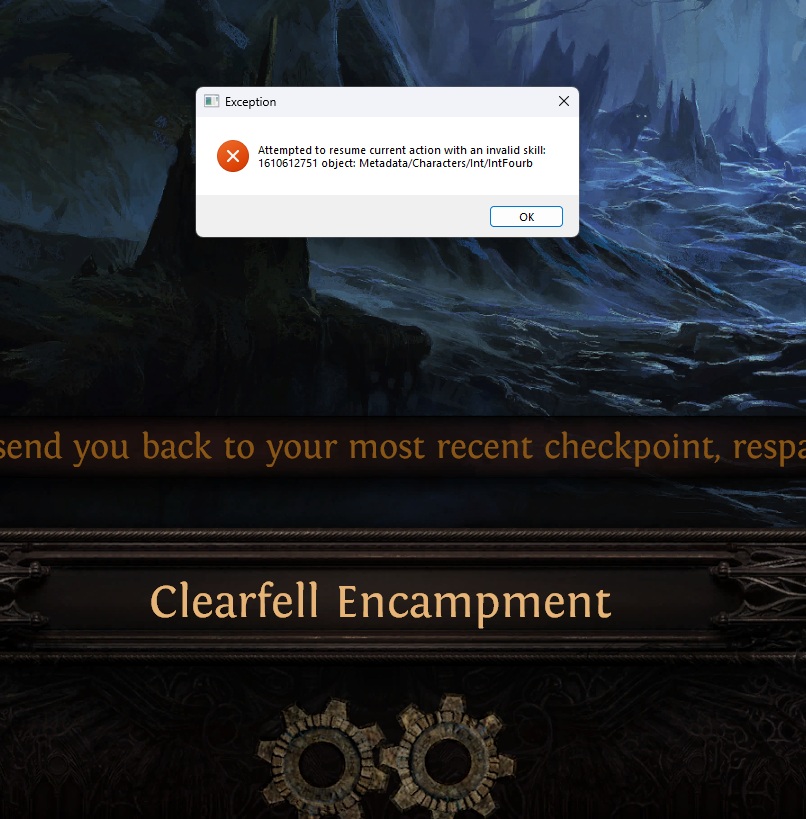 After i killing boss in first act game crashed with this error. Now every time i try load my hero i just crash with same error, restarted many times not works anything.