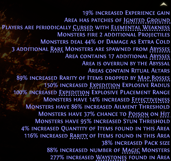 - 2 spirits - 1 Essence mob - 1 abyss - 2 Ritual alters I've been spec'd into "Spreading Darkness" (always have 4 ritual alters) for a while now. I've also ran an abyssal overrun derelict mansion before, and it contained 4 alters with mobs spread out on both levels, and the correct number of "Additional Abysses". Overall the map had 3 total rares including the essence and barely 50 mobs! The mods for the map: ![]() Last edited by Zugtug#3579 on Jan 4, 2026, 2:48:49 PM Last bumped on Jan 4, 2026, 2:47:49 PM